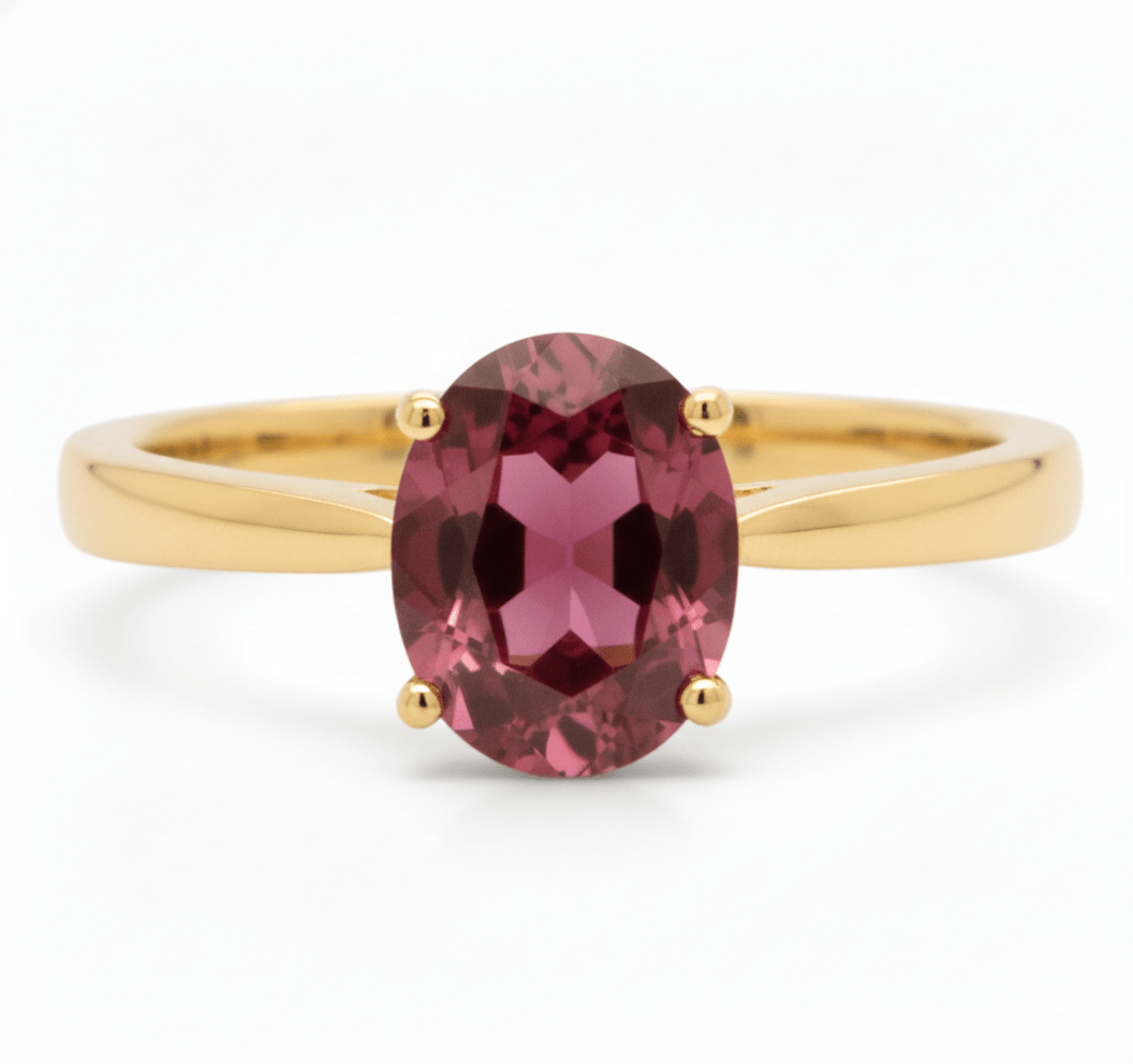 This rubellite ring is simple yet stunning. Featuring an oval cut deep colored center stone, this Rubellite ring is the epitome of elegant jewelry. Rubellite is the rarest of Tourmaline. An everyday stunner, this ring is one of our favorites in our gemstone jewelry collection because of its versatility. Beautiful enough to be worn everyday but alluring enough as meaningful jewelry. Ideal for those who are looking for unique and different wedding rings, this is perfect as a nonconventional engagement ring. From our Gem Drop Collection.