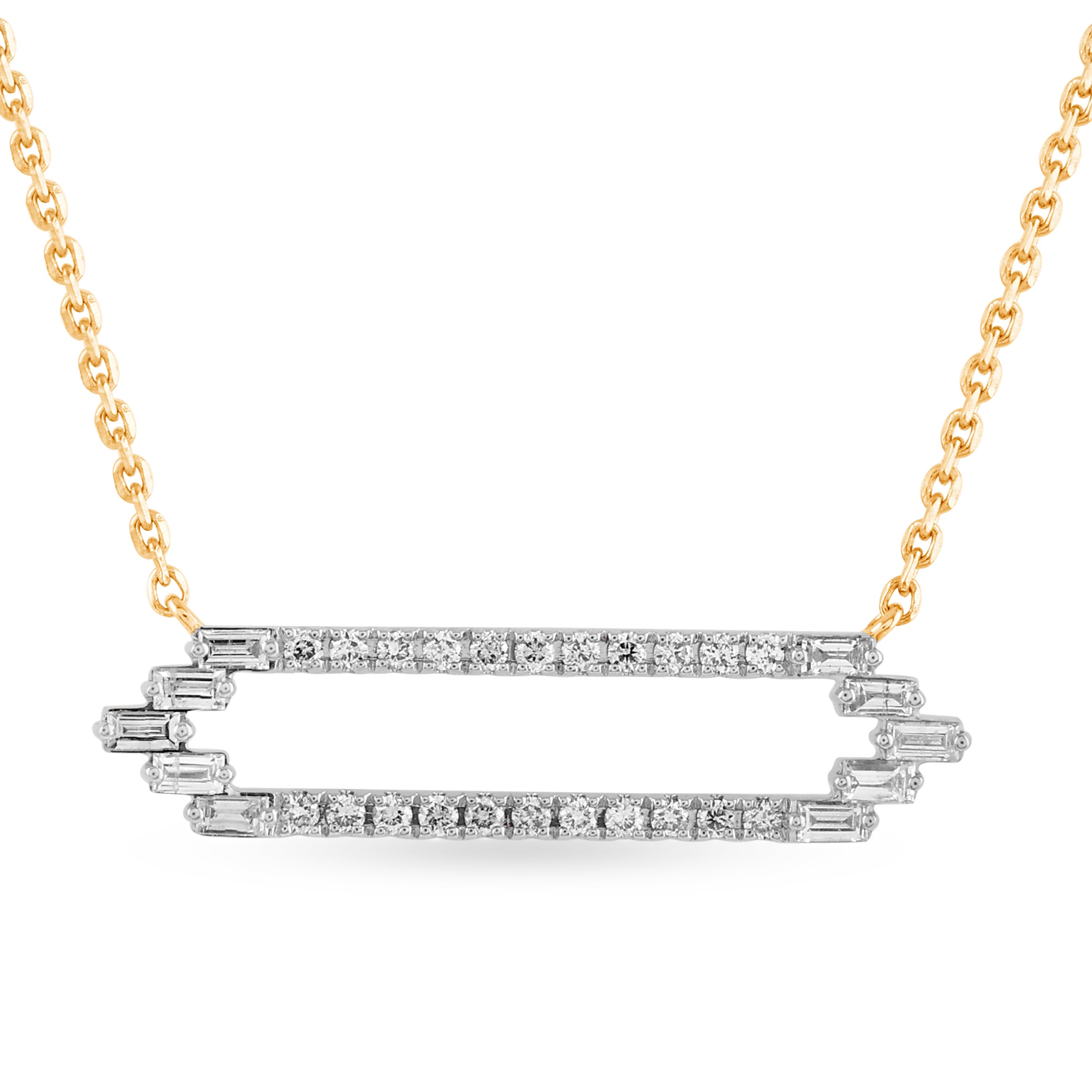 This sparkling Diamond Baguette and Round Fashion Pendant is sure to take any look to the next level. Crafted with baguette diamonds and round diamonds, this unique layering necklace is also a standout piece that will have heads turning. Enjoy the beauty of this stunning necklace and its extraordinary craftsmanship.