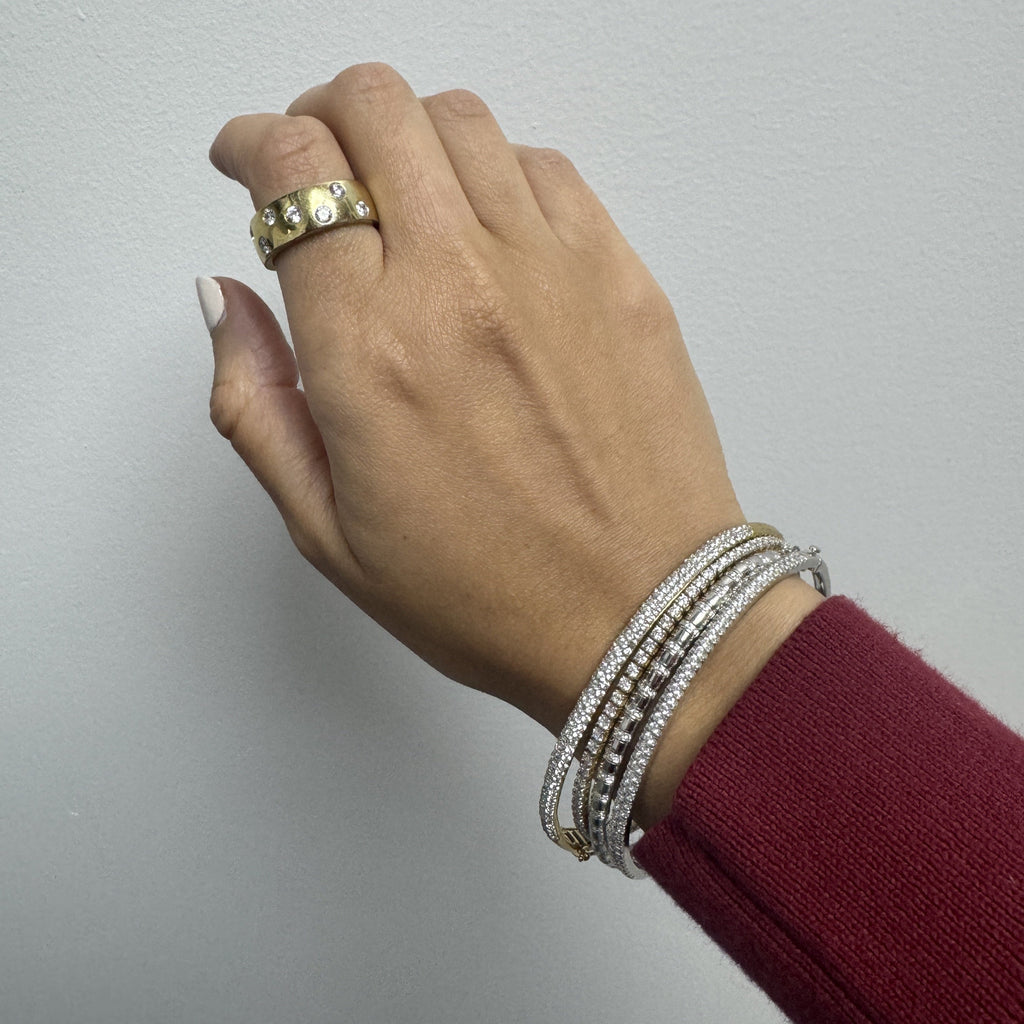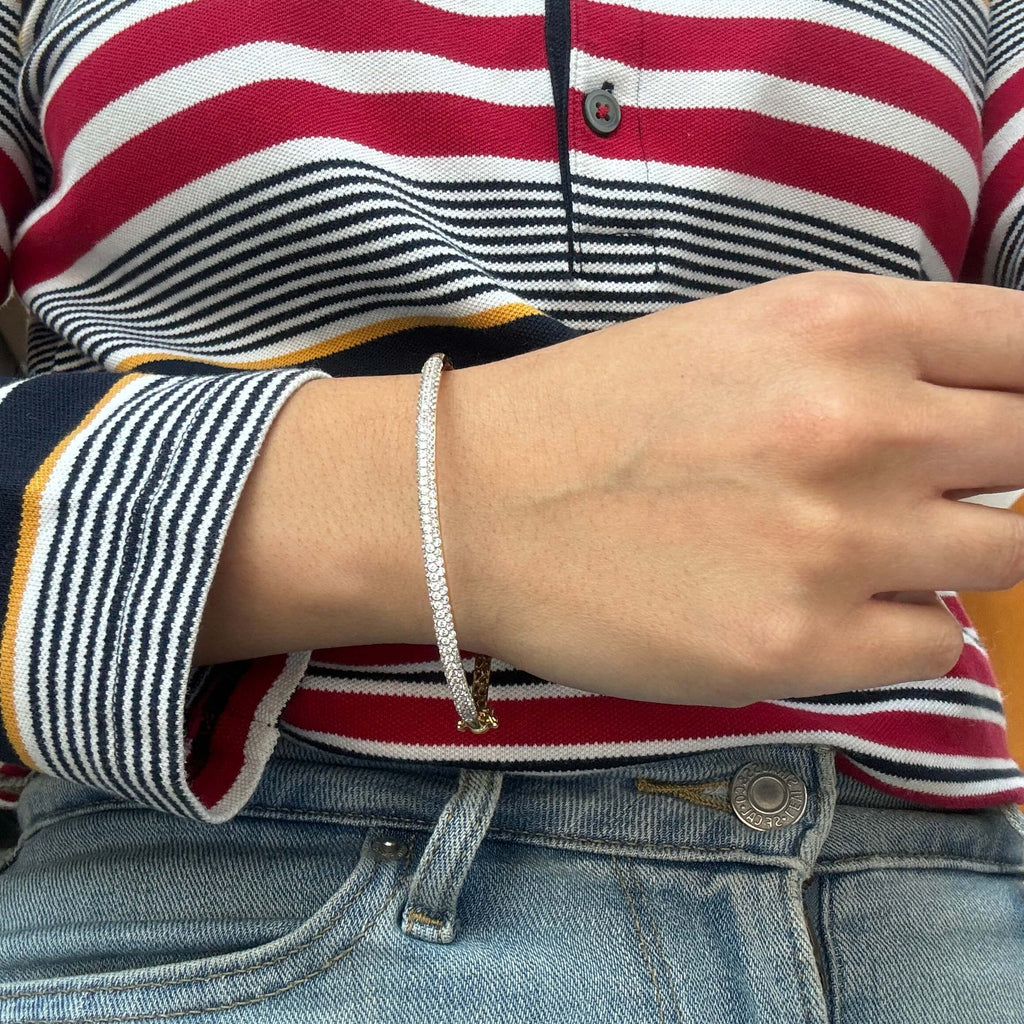Elevate your look with this easy to put on sterling silver cz bangle. Beautiful as a stand alone but also perfect as a stackable bangle. This versatile piece of everyday jewelry will compliment any wardrobe. Part of our Essentials Collection.